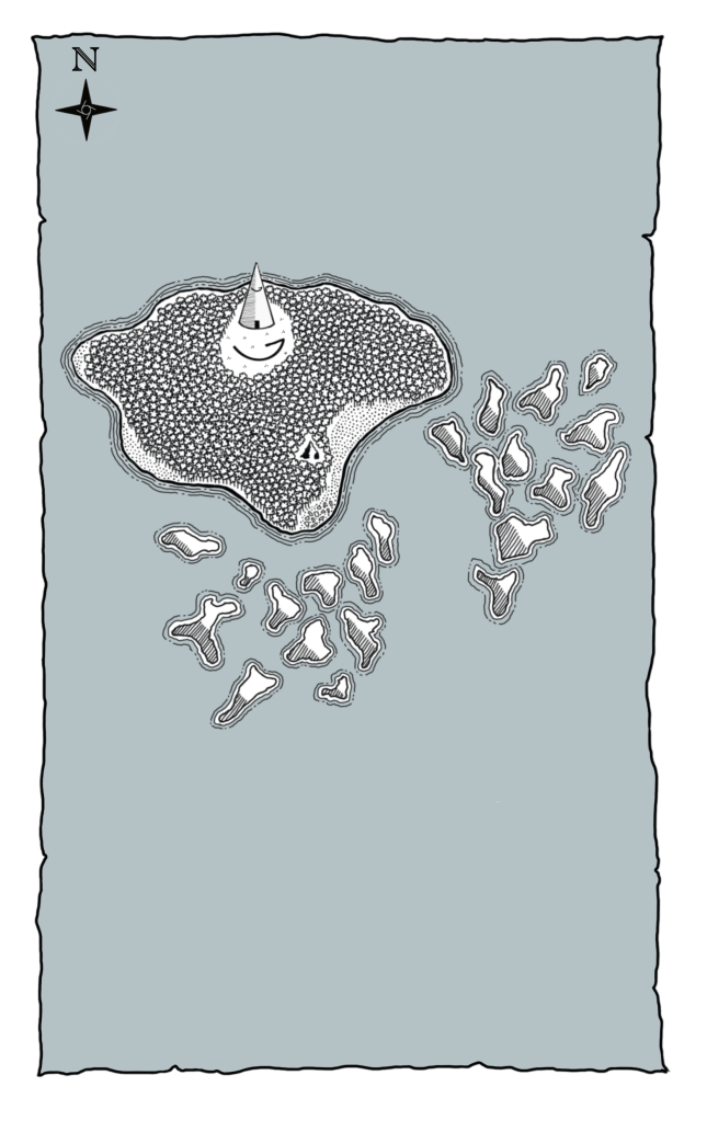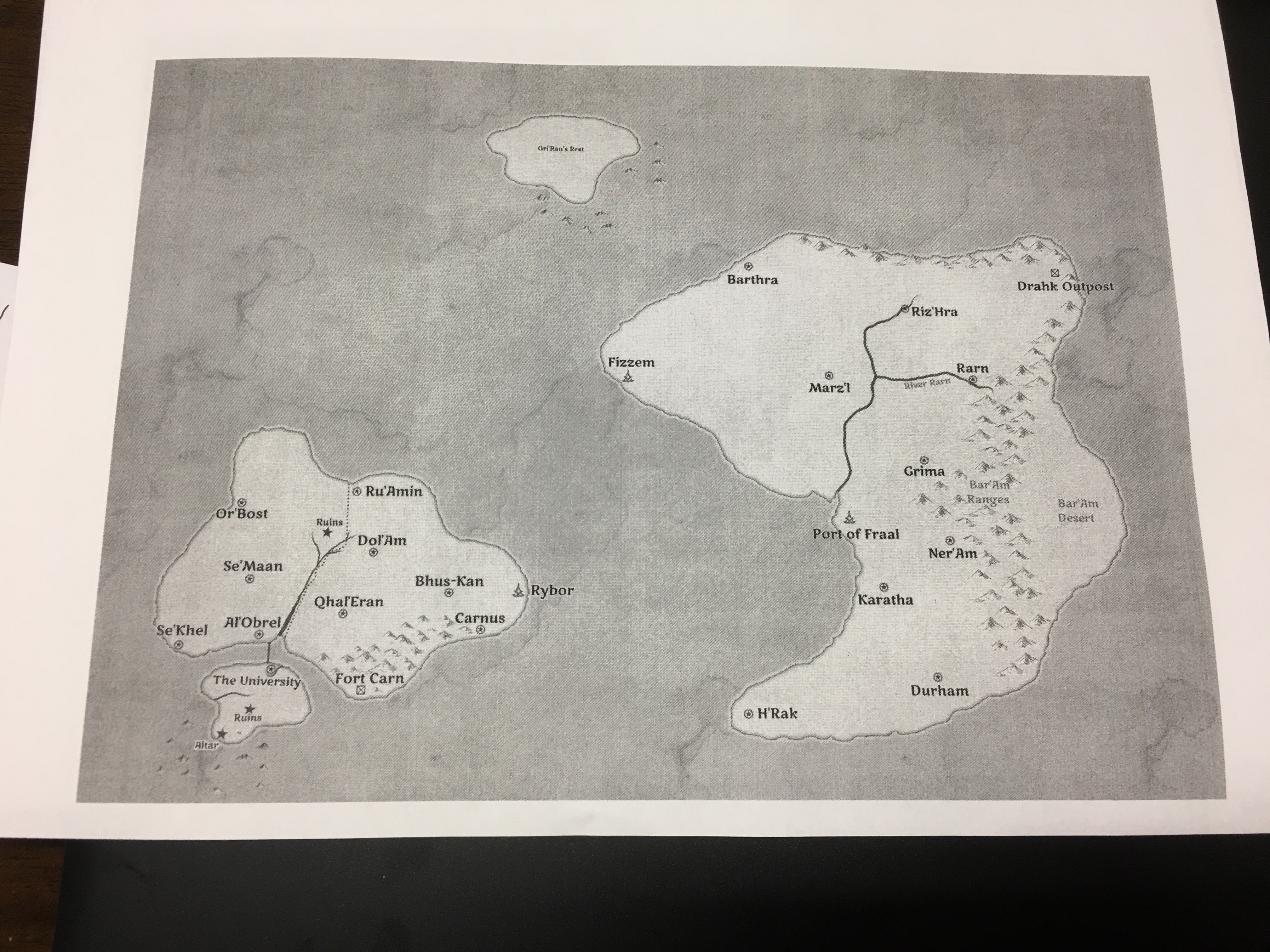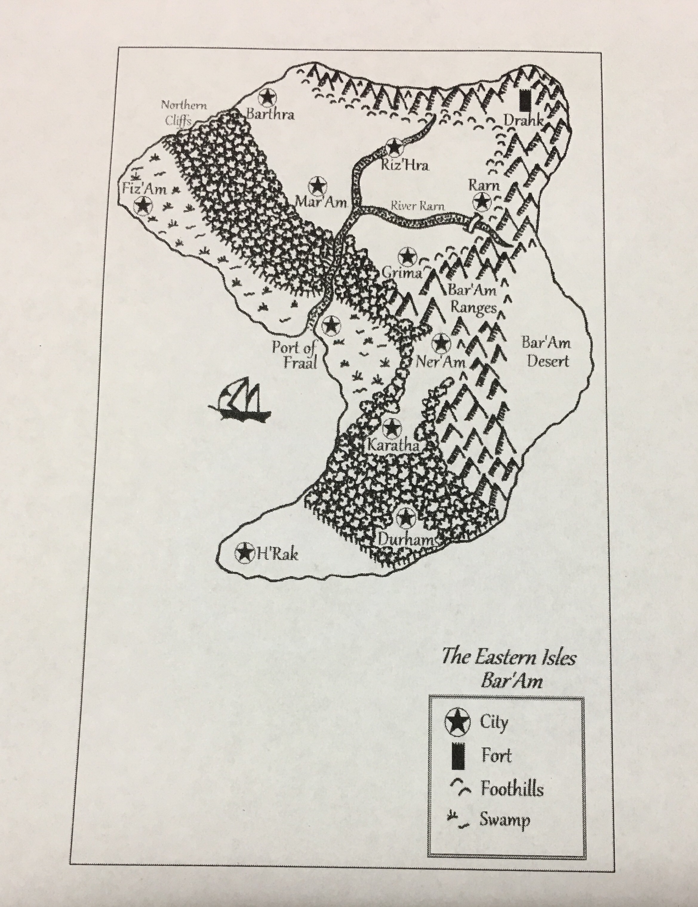 Here is the first published version of the isle now named Bar’Am. You can see that I used software to do the city icons and text. I did manage to draw the little boat myself! As much as I was proud of myself for doing it myself, I still wasn’t in love with it and knew I could do better.