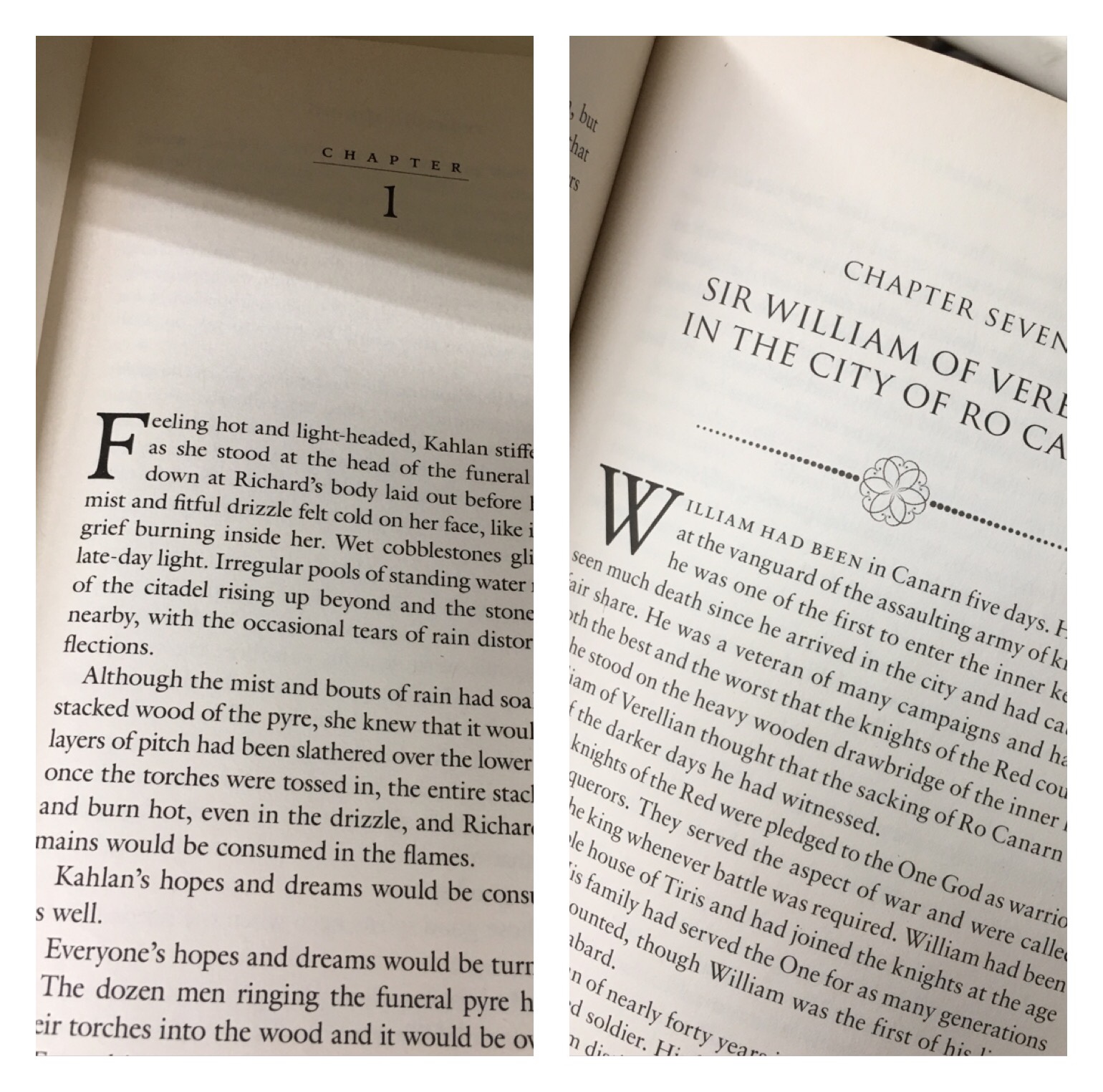 I like the 3 line capitals at the start of each chapter, I think I’ll go with something like this. I also like the linebreak symbol in the second image, I may do something like this but with a symbol that I’ve embedded in the book.
